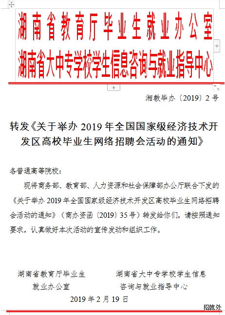 内容简介:转发《关于举办2019年全国国家级经济技术开发区高校毕业生网络招聘会活动的通知》 湘教毕办〔2019〕2号