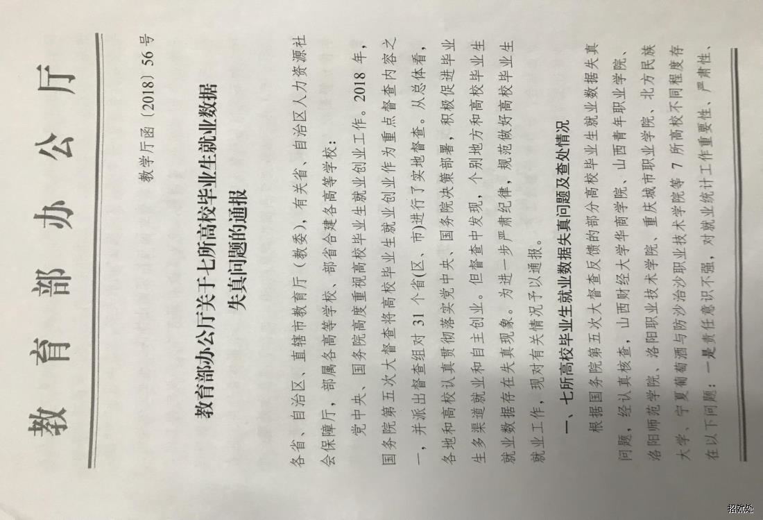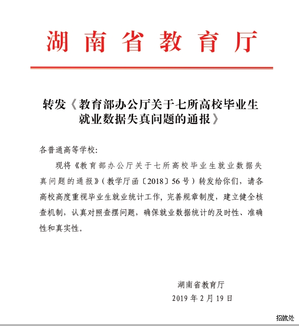 转发《教育部办公厅关于七所高校毕业生就业数据失真问题的通报》 来 源:本站 作 者: 日 期:2019-02-28 10:10:32 点击: 内容简介:转发《教育部办公厅关于七所高校毕业生就业数据失真问题的通报》 上一篇:转发《关于举办2019年全国国家级经济技术开发区高校毕业生网络招聘会活动的通知》 湘教毕办〔2019〕2号 下一篇:【教学司函[2019]20号】关于进一步加强高校毕业生就业动态统计监测工作的通知