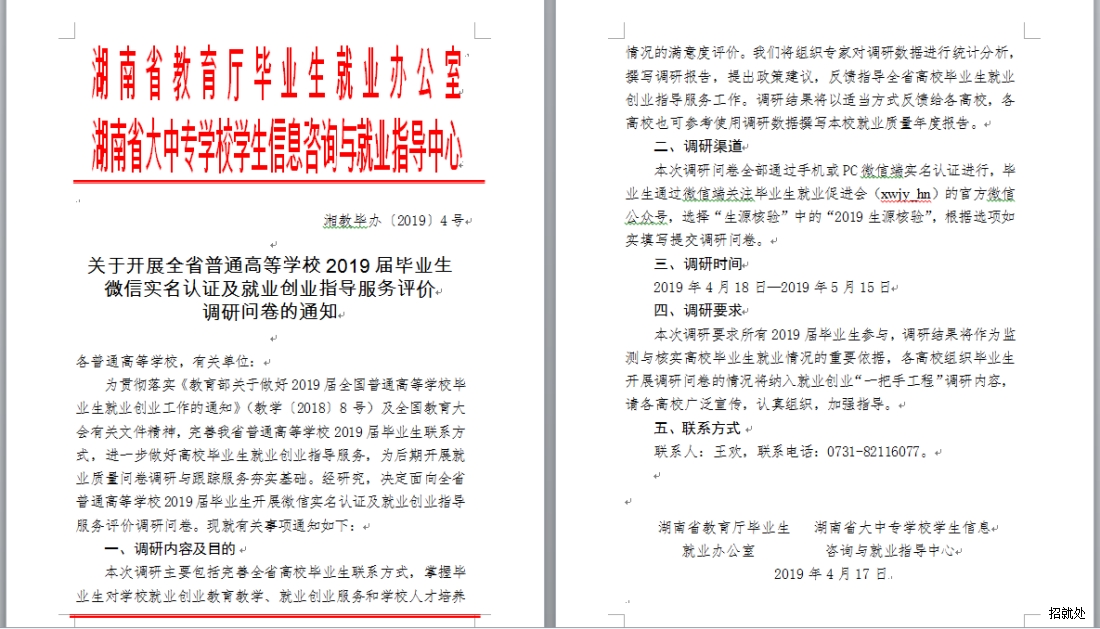 关于开展全省普通高等学校2019届毕业生微信实名认证及就业创业指导服务评价调研问卷的通知 来 源:本站 作 者: 日 期:2019-04-19 08:46:59 点击: 内容简介:关于开展全省普通高等学校2019届毕业生 微信实名认证及就业创业指导服务评价调研问卷的通知 上一篇:湖南省就业指导中心关于办公电话变更的通知 下一篇:关于对湖南省普通高等学校2019届优秀毕业生和创新创业优秀毕业生名单的公示
