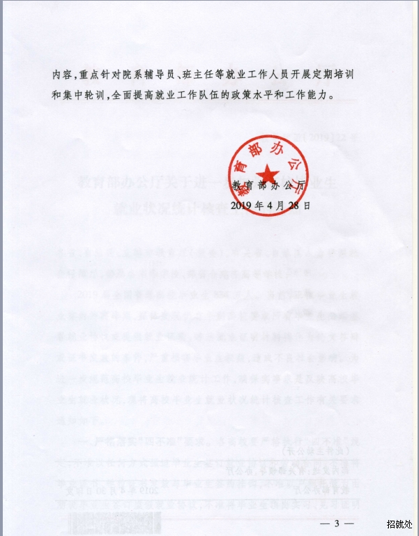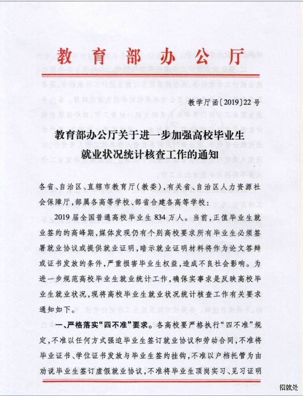 教育部办公厅关于进一步加强高校毕业生就业状况统计核查工作的通知 来 源:本站 作 者: 日 期:2019-05-23 08:28:19 点击: 内容简介:教育部办公厅关于进一步加强高校毕业生就业状况统计核查工作的通知 上一篇:教育部关于做好2019届全国普通高等学校毕业生就业创业工作的通知 下一篇:转发教育部办公厅国务院国资委办公厅《关于举办战略性新兴产业面向2019高校毕业生网络招聘会的通知 》