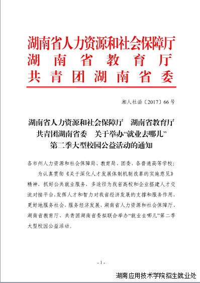 湖南省人力资源和社会保障厅湖南省教育厅共青团湖南省委 关于举办“就业去哪儿”第二季大型校园公益活动的通知