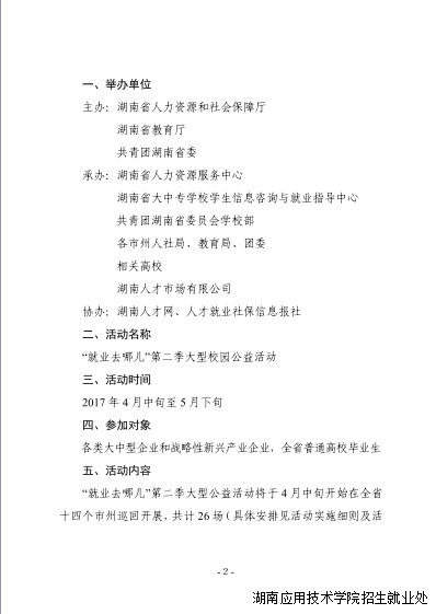 内容简介:湖南省人力资源和社会保障厅 湖南省教育厅共青团湖南省委 关于举办“就业去哪儿”第二季大型校园公益活动的通知
